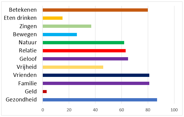De grootste uitschieter naar beneden, nauwelijks belangrijk dus, is geld. Het verbaasde mij wel een beetje dat geld zo laag scoorde. Is geld voor ons echt zo onbelangrijk? Of willen we soms misschien liever ook niet onder ogen zien dat het soms wel als belangrijk voelt? Interessante vraag….
