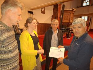 Na afloop kreeg Daoud een cheque van 1000 euro van de diaconie van de Adventskerk-Oosterkerkgemeente. Op de foto zien we van links naar rechts: Hans Hop (diaken), Carline Meijster (diaken), Roelof Klem (gemeentelid en vrijwilliger voor Tent of Nations) en Daoud Nassar (Tent of Nations).